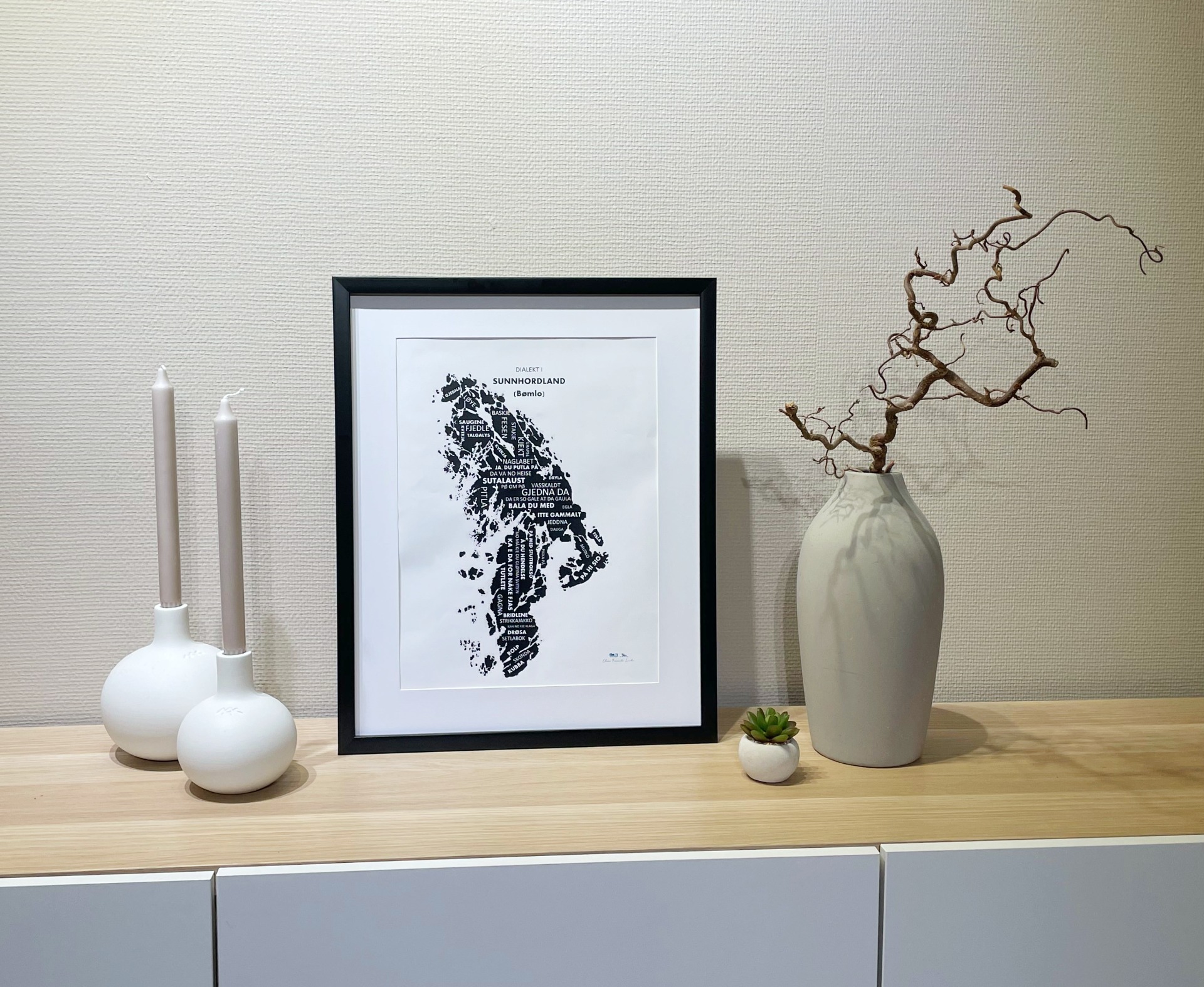 Plakatane vert inspirert av vår lokale tilhøyrsle til Sunnhordland, med våre flotte stadsnamn, og ikke minst vår sterke og framanifrå dialekt med mykje flotte ord og uttrykk.